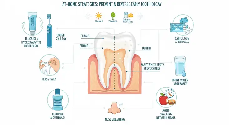 The early stages of tooth decay can frequently be stopped, and occasionally completely reversed, with the correct daily habits, even though advanced cavities require a dentist. Consistency is crucial. Your enamel is more affected by small daily actions than by a single treatment.